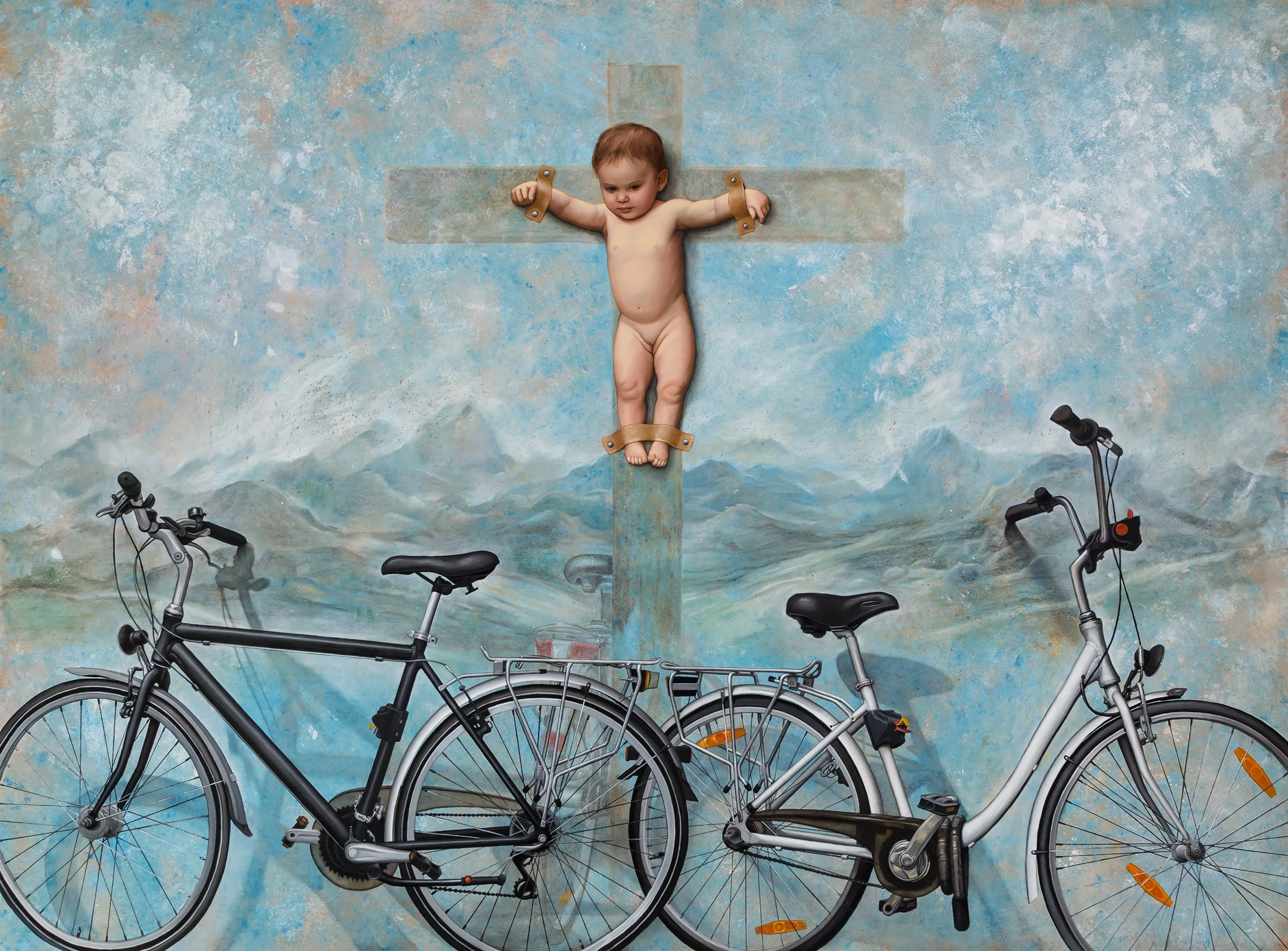 A surreal exploration of destiny and innocence, About Fate suspends the viewer between the weight of sacrifice and the fragility of beginnings. A child, untouched yet bound, is fixed to a cross—an eternal symbol of surrender and inevitability—while two bicycles, symbols of freedom, journey, and choice, stand motionless below. The background unfolds into a dreamlike landscape, where sky and mountains dissolve into soft, otherworldly blues, blurring the boundaries between earth and spirit, chance and design.
