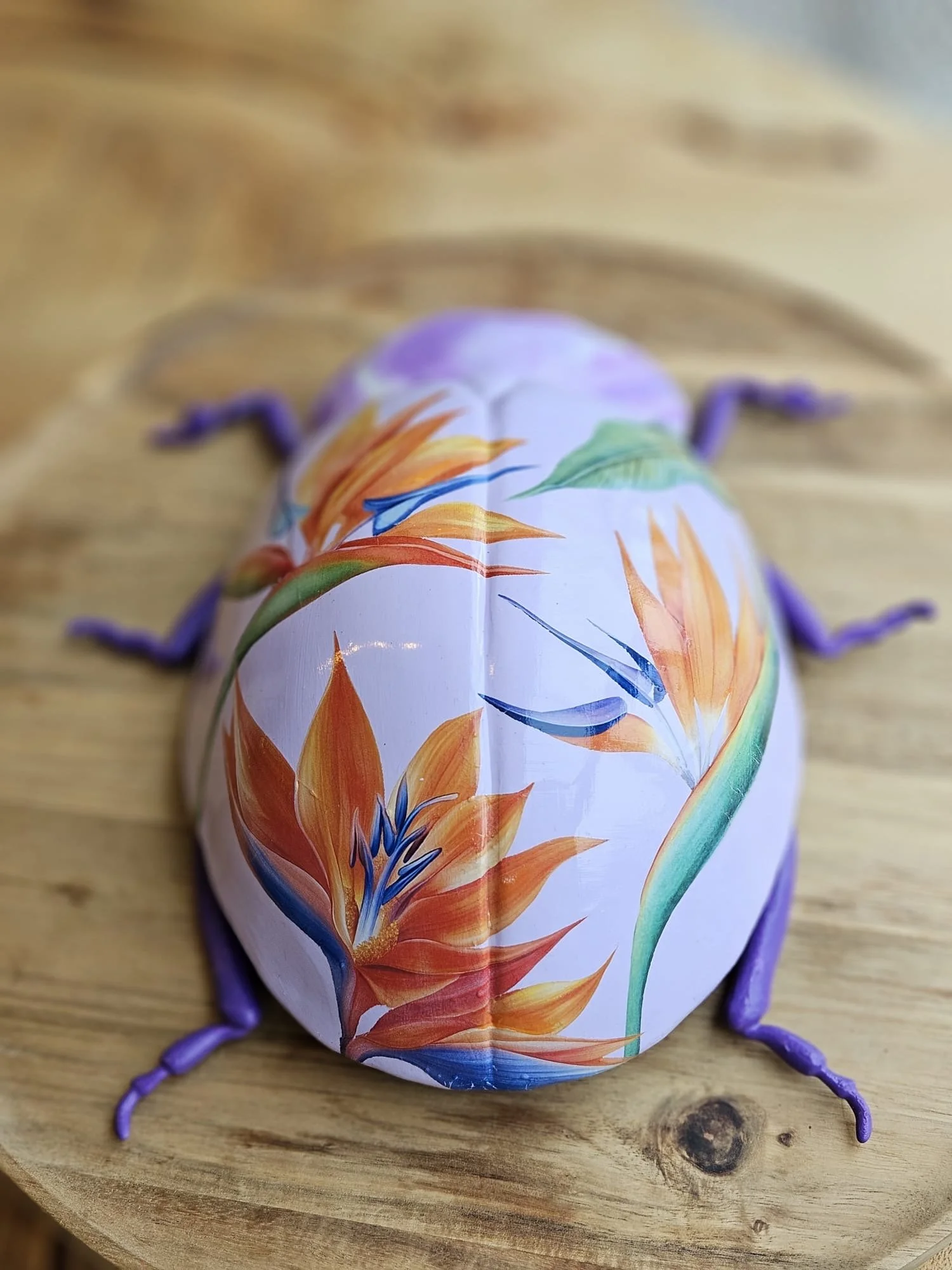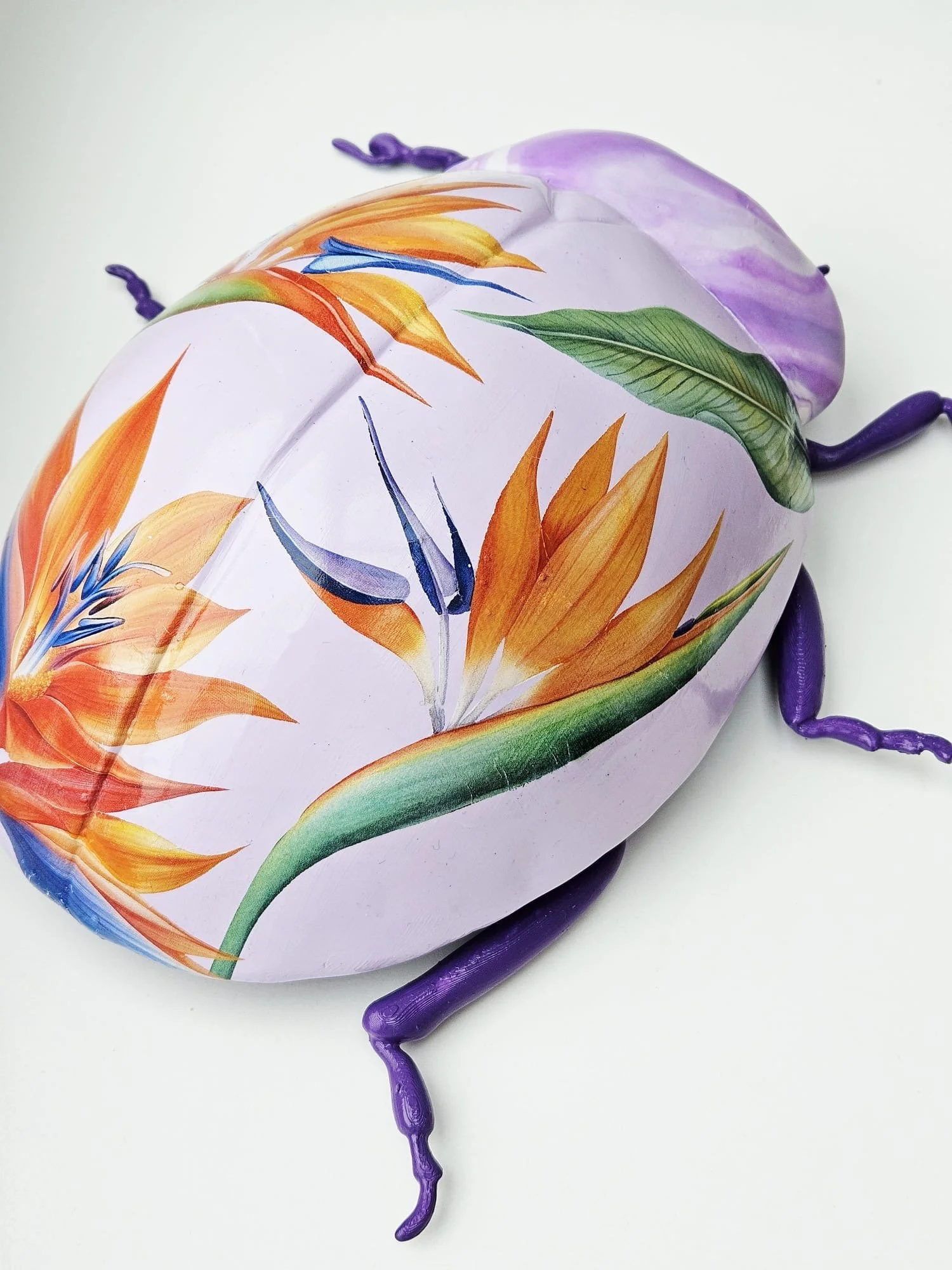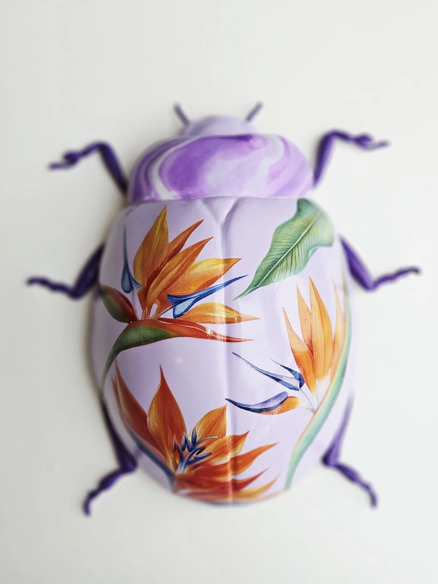 A celebration of resilience in miniature form, Bird of Paradise Ladybug fuses natural wonder with whimsical elegance. The classic ladybug silhouette is reimagined in soft lilac, its shell blooming with hand-painted Strelitzia flowers—symbols of freedom, joy, and strength.