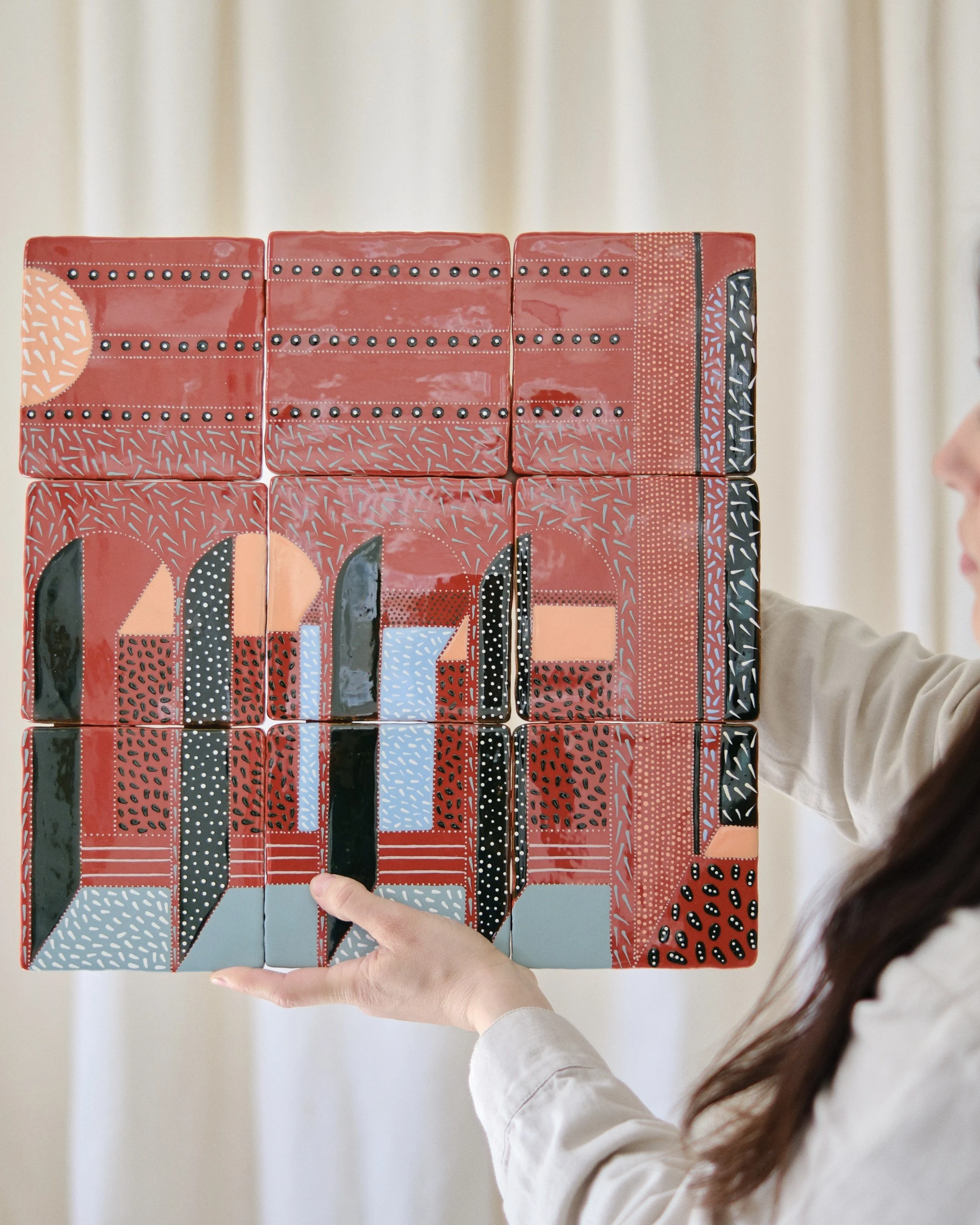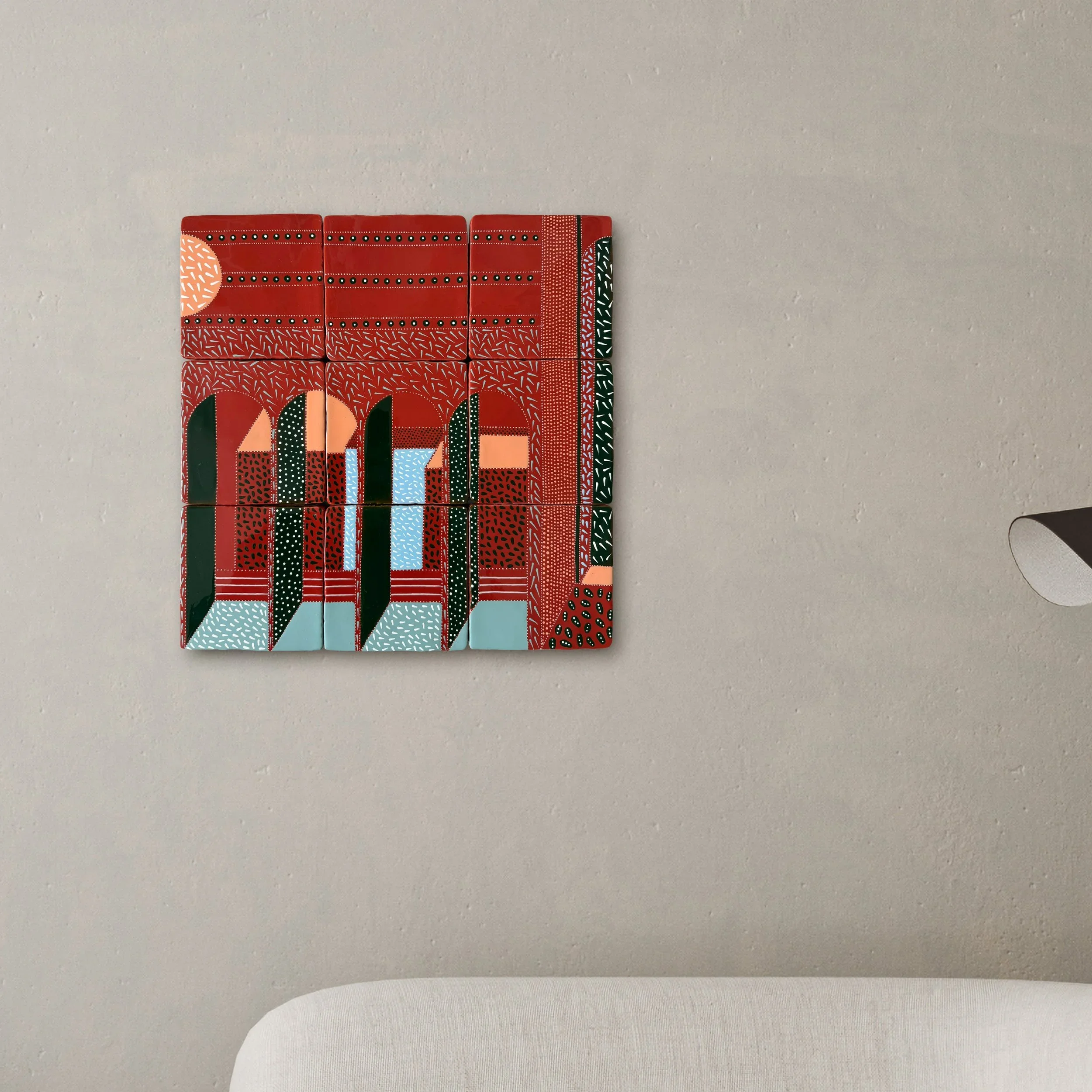 A poetic abstraction of island life and architectural identity, Chora I reimagines the characteristic rooftops, arches, and landscapes of a Greek island town through geometric tile composition. Rendered in soft Mediterranean hues—whitewashed blues, dusky ochres, and terracotta red—the piece honors tradition and place while maintaining a modern aesthetic.