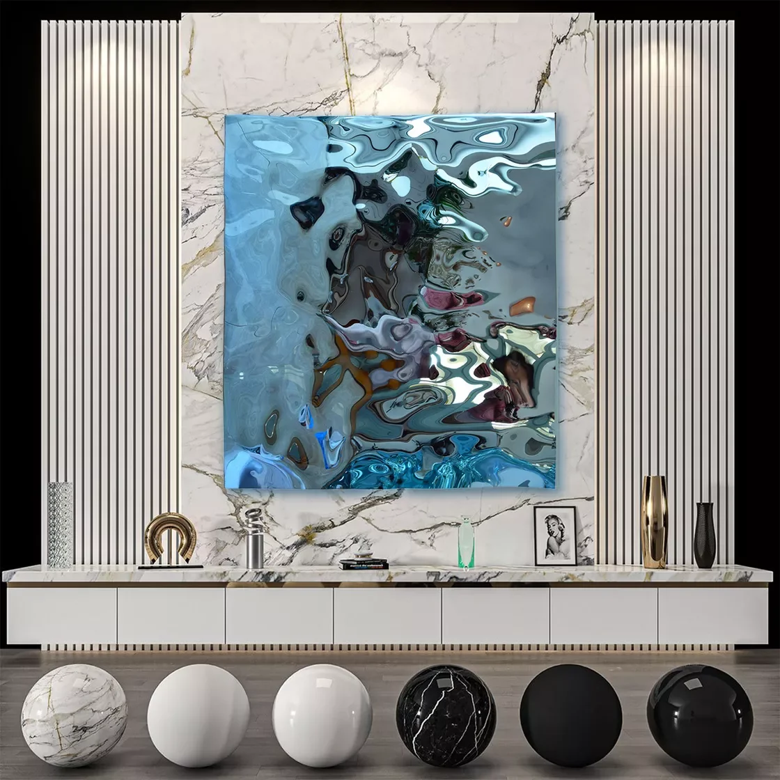 A crystalline vision of melting ice seen from above. Ice Ice evokes the fragile geometry of polar landscapes, its glossy, light-blue surface glinting like ice floes under sunlight. Subtle ripples and bends translate ocean currents into sculptural form, while gentle reflections shift with the viewer’s movement—always in motion, yet eternal. At times you might perceive polar bears crossing its thin ice; at others, simply the delicate balance of memory, water, and light.