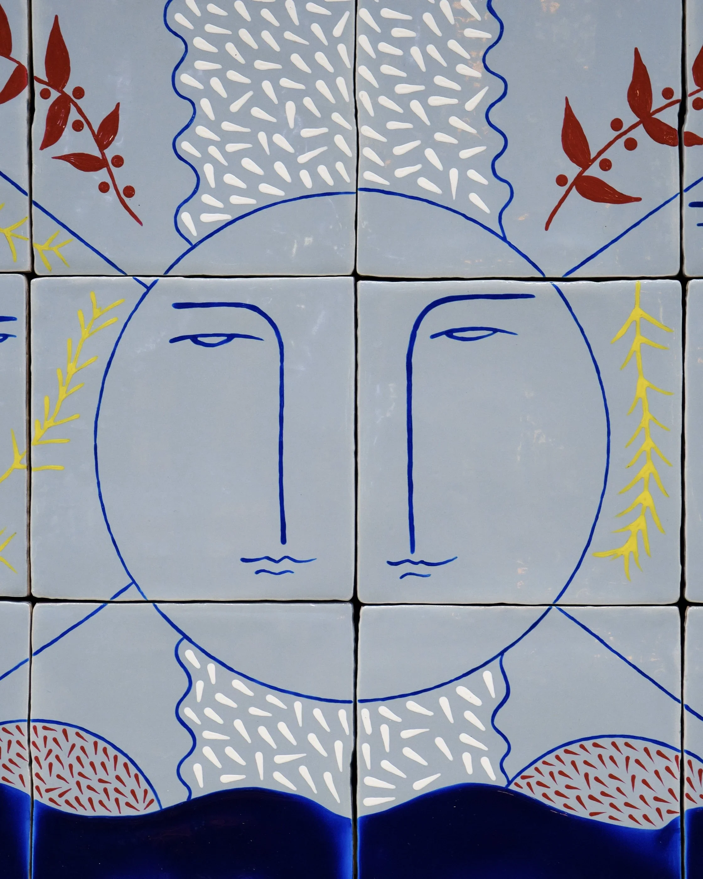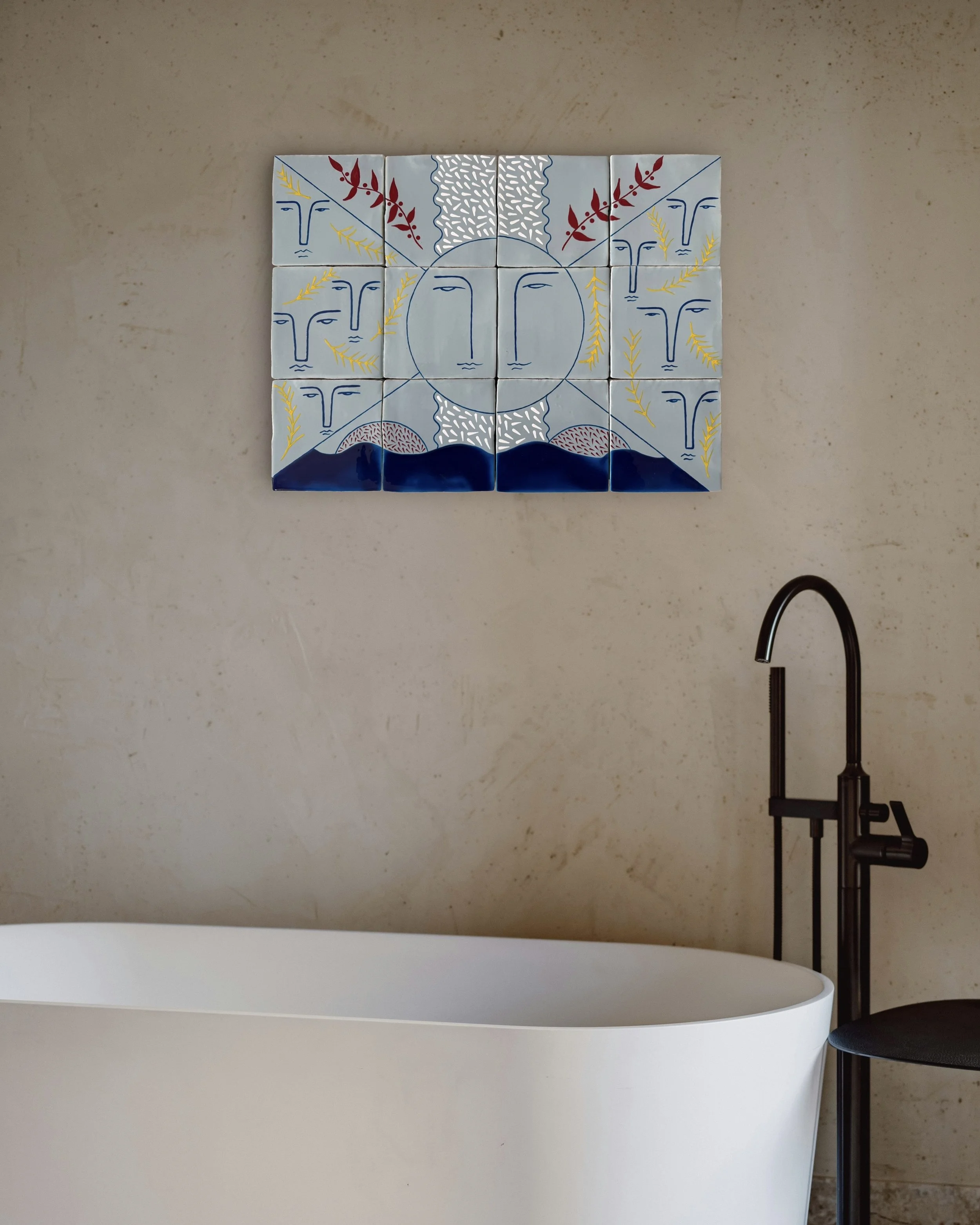 A radiant mosaic of myth and memory, Sun Spirit transforms modest ceramic tiles into a luminous meditation on light, tradition, and Mediterranean heritage. Each glazed tile contributes a fragment of the whole—a sunlit horizon stitched together through delicate brushwork and vibrant tones.